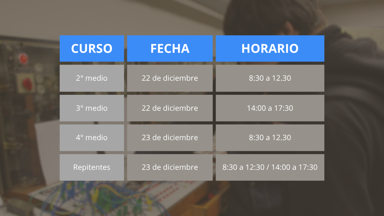 Pueden matricular hasta el martes 23 de diciembre (fecha entregada por MINEDUC). Los días 9 y 10 pueden conocer al profesor jefe, desde el 11 de diciembre en adelante, el proceso es directamente en inspectoría.